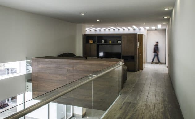 The high floor holds the private spaces: main and secondary bedrooms, homework studio, and TV room. This last room lies on a wood-lined volume that delimits the dining room and enables the view of the living room and garden through a double-height. The main bedroom is isolated from the other areas by a privacy-bringing bridge.