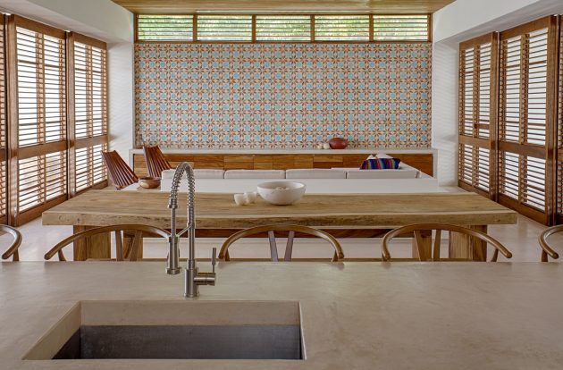 Materials used in the house were all locally-sourced, including louvered wood sliding doors, and hand-painted “pasta tiles”. Tulum-based craftsmanship is emphasized, with intricate stonework for selected walls, and site-built furnishings throughout.