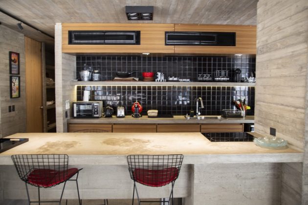 A hole in the roof allows the views to be released towards the tops of the pines and in turn locates an outdoor living room with a fire pit to set the mood for evening gatherings. The main partition gives a compact image and once it frames the access and privacy to the social area and the gallery with its voids. It also houses a fireplace for winter family gatherings around it.