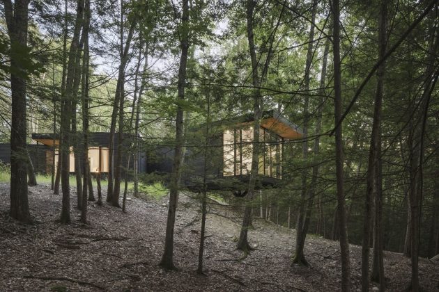 In Kerhonkson, New York, a floating fitness studio soars above a natural ridge, anchoring a curated private sanctuary in the woods. At the foothills of the Catskill Mountains in New York’s Hudson Valley, a densely wooded site with dramatic changes in elevation presented a unique opportunity to create moments of shifting perspective.