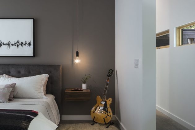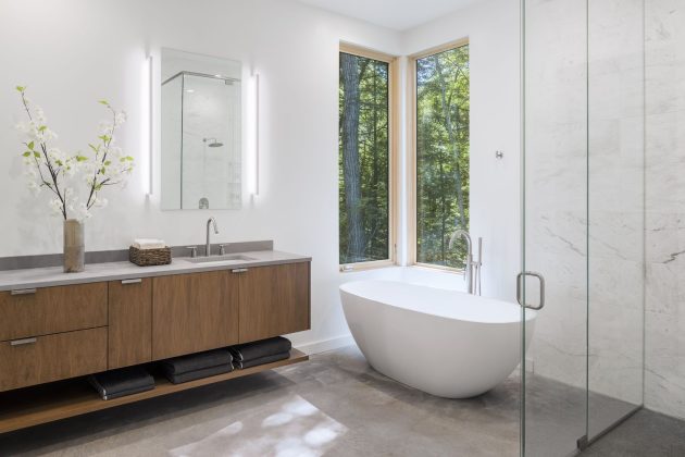 Elsewhere in the home, shifting views of the site evoke different feelings and new experiential interactions with the environment. From the home’s open living room and patio, large expanses of glass put forest views front and center. The gently sloping topography outside the main living space presents a different vantage point than the studio, eliciting the feeling of being among the trees rather than above them. The main suite includes a spacious freestanding tub – a place to both relax and heal after running.