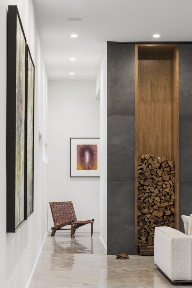 The studio volume is deliberately pulled apart from the rest of the home, accessed via an enclosed gallery. Following the ridgeline, the gallery emphasizes the journey to the studio, while displaying deeply personal mementos and works of art – visual reminders of formative accomplishments and memorable life experiences. The studio, enclosed by glass on three sides, is a dedicated space for the pursuit of personal passions – for this client, it is running. A treadmill and an indoor cycling bike enable focused physical training while maintaining an inspiring visual connection with the wooded landscape.