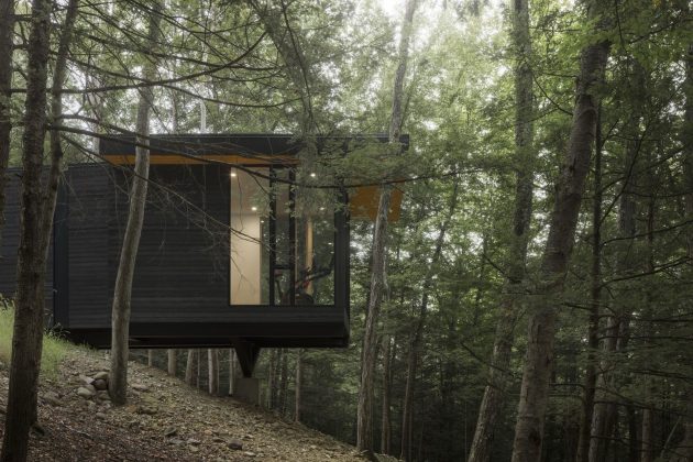 Cat Hill House is a stunning private residence located in Kerhonkson, New York, designed by Studio MM Architect. The house sits on a densely wooded site with dramatic changes in elevation, providing a unique opportunity to create moments of shifting perspective. The main volume of the home parallels the ridge, while a gallery and studio space extend horizontally along the knoll. The glass-enclosed fitness studio extends over the ridge and appears to float above the landscape.