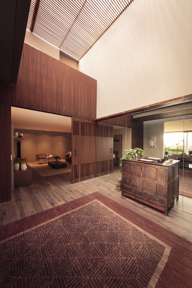 On the first floor, through a double-height lobby, the social areas are oriented towards the west and two bedrooms are oriented to the east, both with bathroom and dressing room, giving the feeling of living on a single floor.