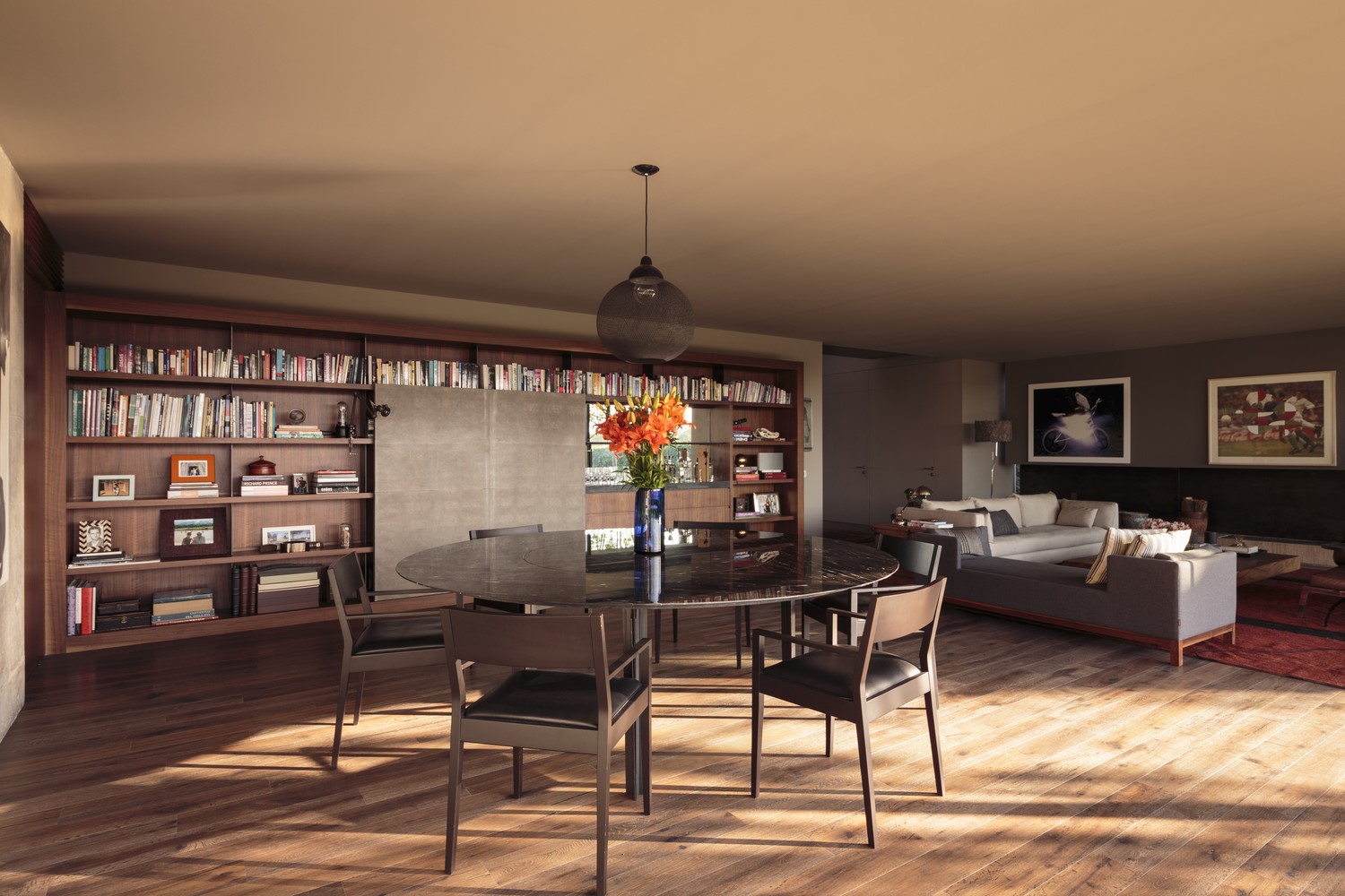 In the living and dining area, contained in the same space, a terrace runs parallel the entire length. Upon opening the glass doors, the terrace is integrated with the interior, cohabiting at the same time with the garden.