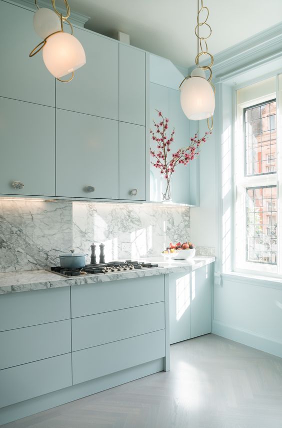 Also play on diversity, by daring to integrate a mustard yellow or a soft pink. Both perfectly complement the neighbouring shades of water green, this is also the case with intense blue.
