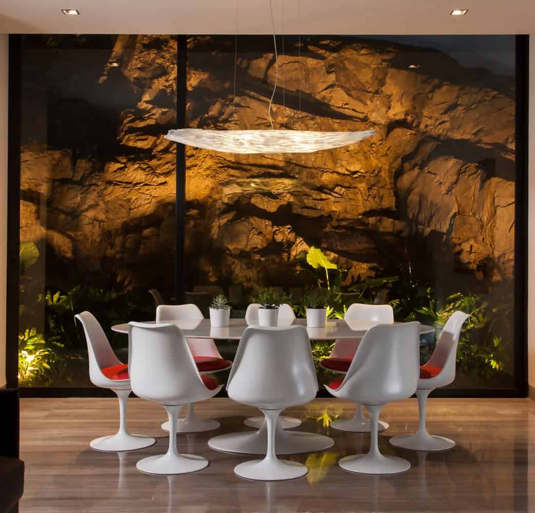 The kitchen, breakfast room, family room and master bedroom enjoy this visual effect. Towards the front of the property, a large semi-covered terrace is built around an infinity pool, which makes us forget for a moment the urban condition of the project, thanks to the large green areas of a park just in front of the property, which visually joins the huge greenery of the Country Club golf course.