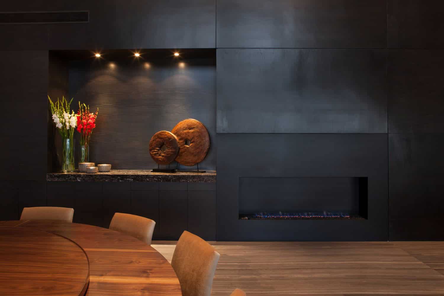 The materials, mainly the gray exposed concrete, the gray oak wood and the black granite facades, as well as the indoor and outdoor white stucco, contribute to the project a both refined and contemporary character.