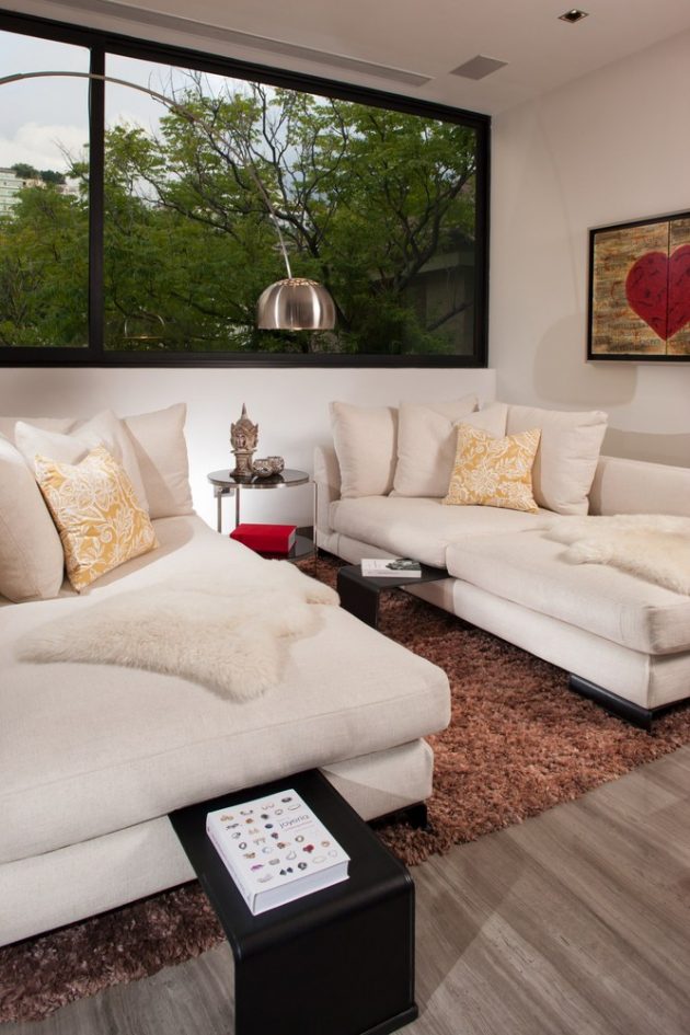 Inside the house, a large double height living room with a set of exposed concrete skylights becomes the heart of the project, due to the interesting effect of the controlled natural light that floods the whole area. Around such space, the bedrooms, decks, home theater, and home office complete the program. In the last level , such home office enjoys the splendid views of the city, in addition to being visually connected through a large window towards the double height living room, acquiring a condition of great transparency and giving the sensation of being a floating bridge over the terrace.