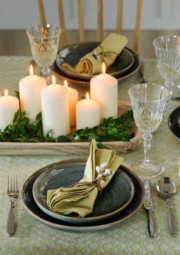 Still, looking for easy to make Christmas napkin rings? Here we leave you another proposal that could not be easier to achieve. A twig, a string, and a green linen napkin perfect to give the table a natural look along with the wooden center with leaves and candles. If you can, choose tableware that looks handmade.
