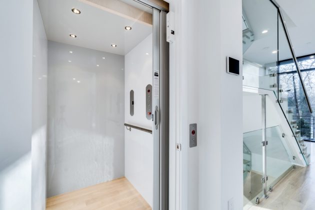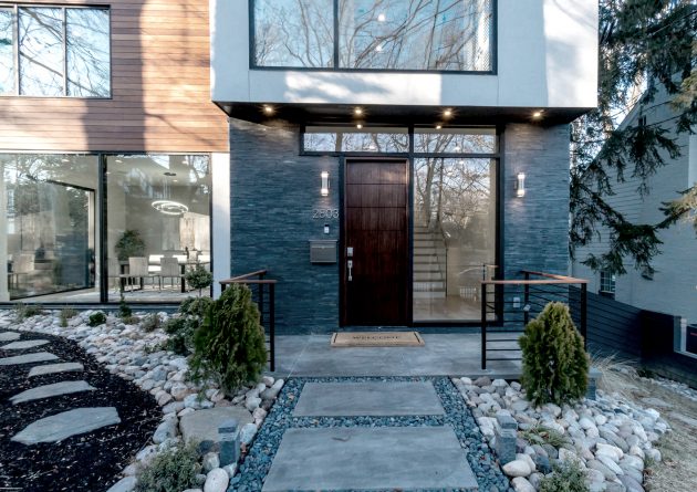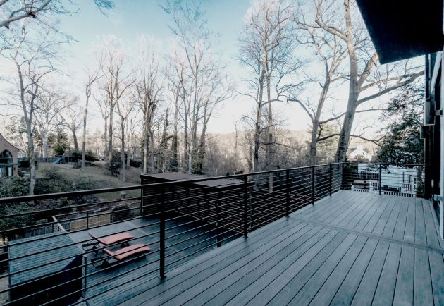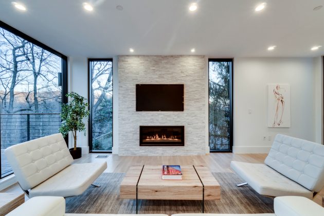 KUBE Architecture have designed the Chesapeake House in NW Washington DC on a site that is steeply-sloped and surrounded by a raw forest. The house was designed to be constructed efficiently with a series of vertical volumes that are situated around the trees and down the slope of the site. The design also makes use of large windows that expose the dining room towards the street but also flood the interior with natural light.