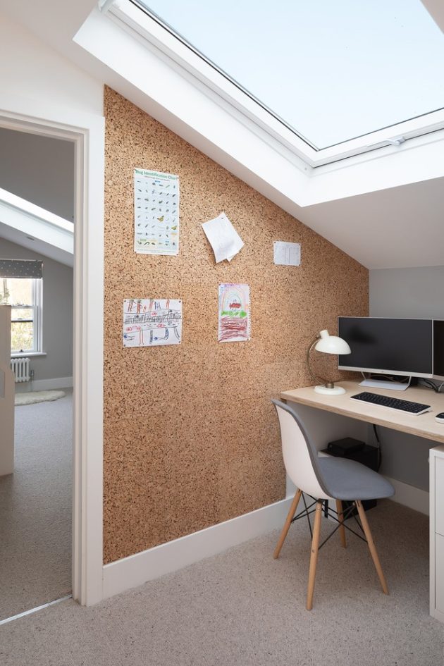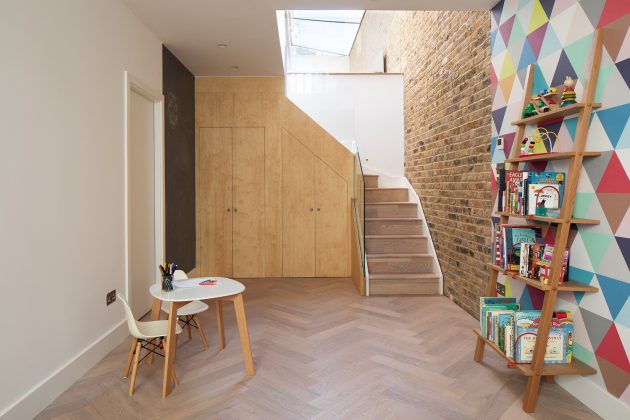 Re-configuring the stairs allowed Sketch to create a range of clever, innovative storage ideas, maximising the use of space. The hallway now feels wider and uncluttered despite the challenges of family life. Throughout the house they have used a number of natural materials; exposed bricks, painted steels, glass and wood. In the kitchen and basement, they have created storage using birch ply and upstairs added an office space on the landing continuing the use of plywood for the desk built into the eaves with large roof lights overhead.