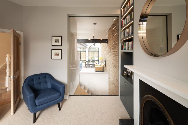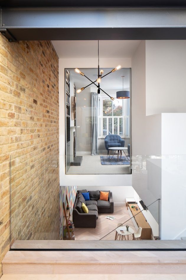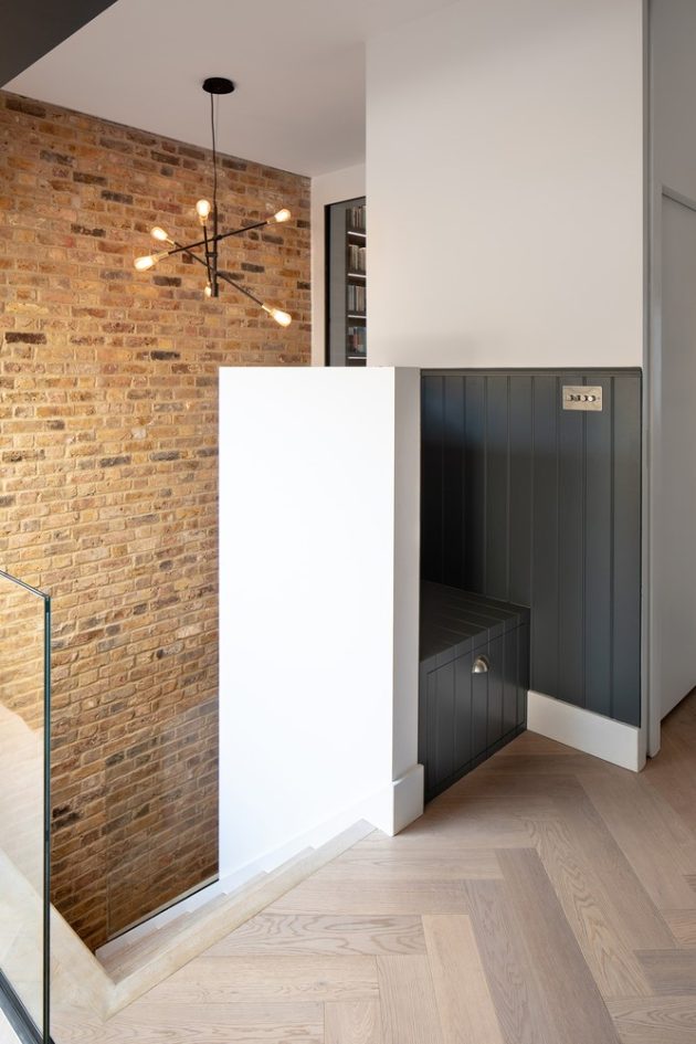 To achieve this Sketch Architects introduced a double height space in the centre of the house, shifting the location of the stairs to allow light in from a new glass roof at the rear, with additional walk on glass in front of the house. Too often basements feel dark and segregated but they have instilled a sense of light and connection, creating an inviting space, linked to the rest of the house. The floor of the kitchen at the rear or the property was lowered both to enhance the flow into the garden and increase the lines of sight into the basement. Finally, an exposed brick wall covers the entire double height space extending to the rear of the property giving more continuity to the design.