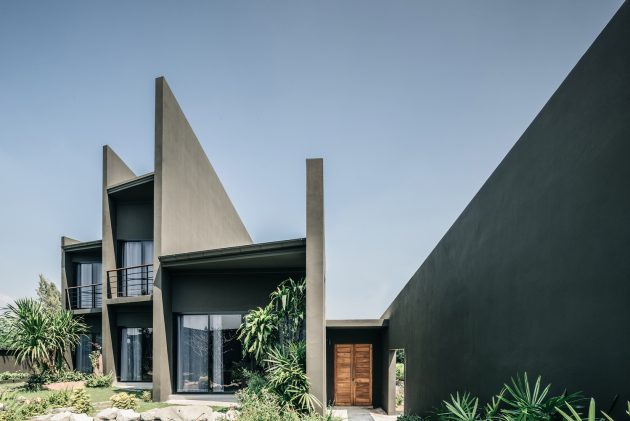 The angular surfaces carve out three main volumes evoking the massive stones (or sila in Thai) being pulverized nearby. These planes also shield residents from viewing the nearby motorways and junkyards, while at the same time, they provide each volume with views channeled toward the garden to the South. The three soaring dividers anchoring the house’s design give away very little as to the true shape and size of the interior volumes. From some angles, the interior seems completely hidden with them, while from indoors and from the garden, the walls seem to almost disappear, making way for a vast sense of openness.