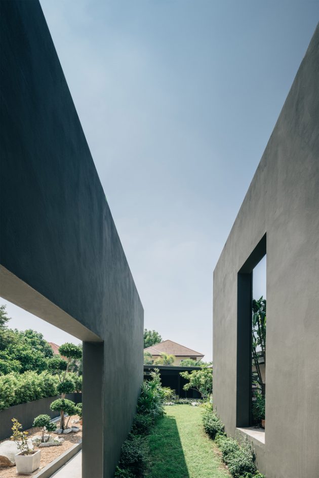 Notwithstanding Chonburi’s specific challenges, all of Thailand suffers from an overabundance of daylight and heat. In response, the double walls designed with air-gap insulation slice into the house, a design that catches the breeze, channels it through windows, skylights and carefully positioned openings. This creates effective cross-ventilation so that every part of the house is naturally illuminated yet shielded from the elements.