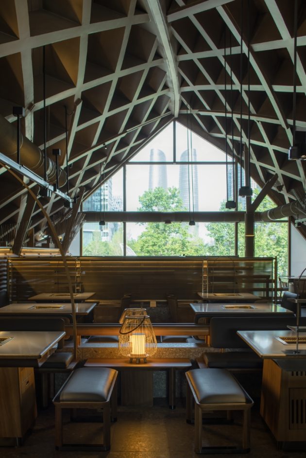The fluid slanted roof from the original structure is kept and gave rise to the design idea of an idyllic life. The bamboo-woven tools for manual labour were the best assistants of the people in west Sichuan. We have reinterpreted them and created many related interior components, including awnings and screens, which became an extension of the spatial impression.