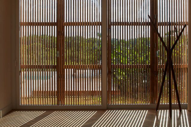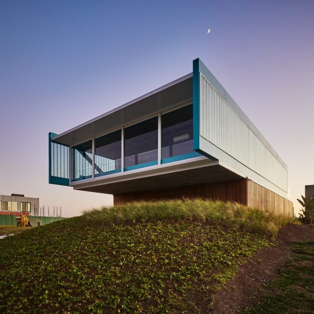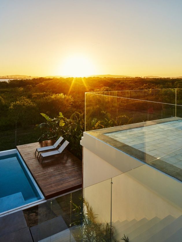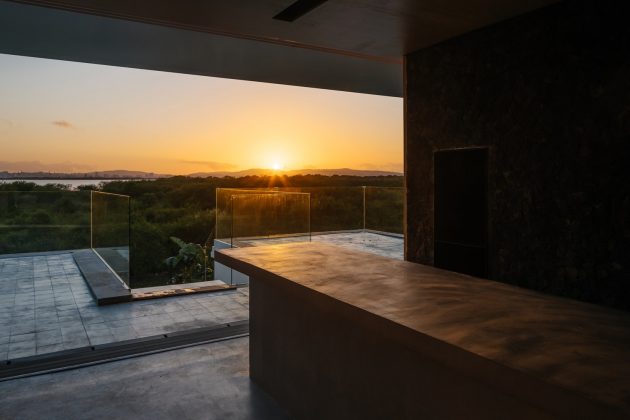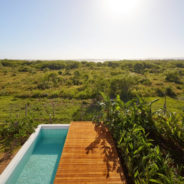 The site is located in a gated community, bordering both an ecological reserve and a river. While the vegetation initially blocked views of Porto Alegre’s skyline, the architects discovered that from 2.5 meters above ground level, the view opened completely.