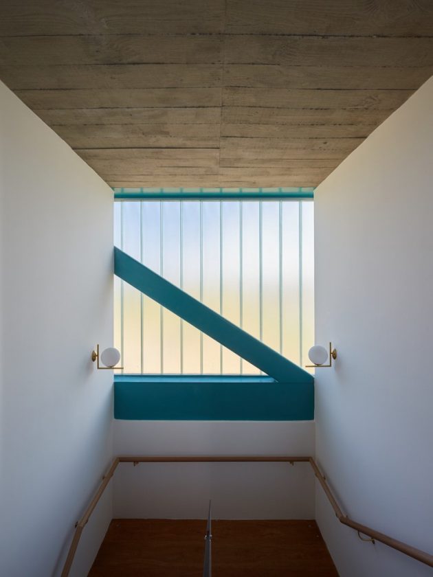• Two blue-painted metal trusses span the second floor, creating a 7-meter cantilever that shades the garage. The steel structure was assembled in just five days.
