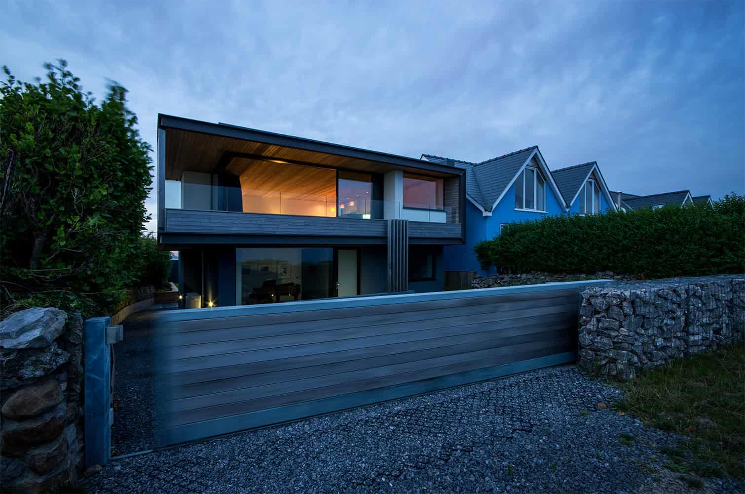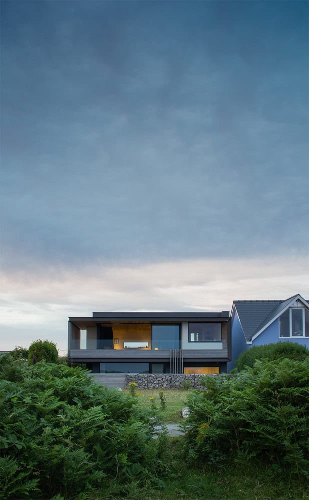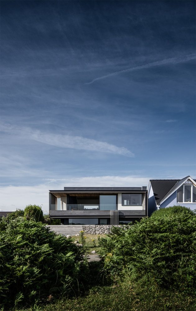 The building is constructed from insulated concrete formwork giving it a highly insulated air tight perimeter. To balance the heaviness of the building fabric a cedar clad balcony frame is introduced to focus on sea views, with vertical and horizontal planes creating a series of sophisticated spatial layers. Angled louvers are intended to help create a semi-transparent object whilst avoiding overlooking and to provide wind protection. It also creates adaptable rain canopies, solar shading, cover for a carport and an entrance canopy.