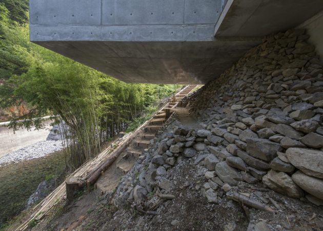 In view of the possibility of the sharply inclined riverbank collapsing or the river rising, it would be dangerous to set a tall pillar on the shore and support the residence on that side, but if we built a two-floor structure beside the road, with parking on the first floor and a residence on the second, the lovely scenery would suffer.  My solution was to dig down nearly to the bedrock and sink the building into the ground, then extend it out into the air over the river.  The key to the structure is the creation of balance.