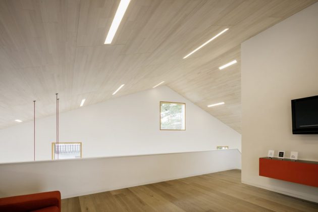 Inside the ceiling is made from the same Black Forest silver fir, inlaid with flush LED light slots. A central chandelier illuminates the point where the two buildings meet.