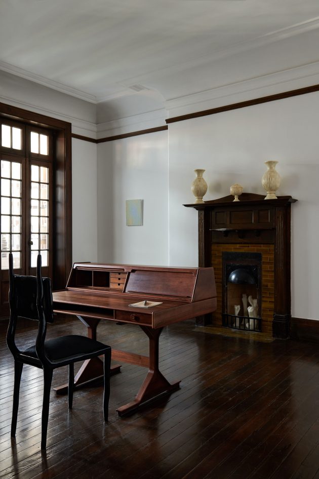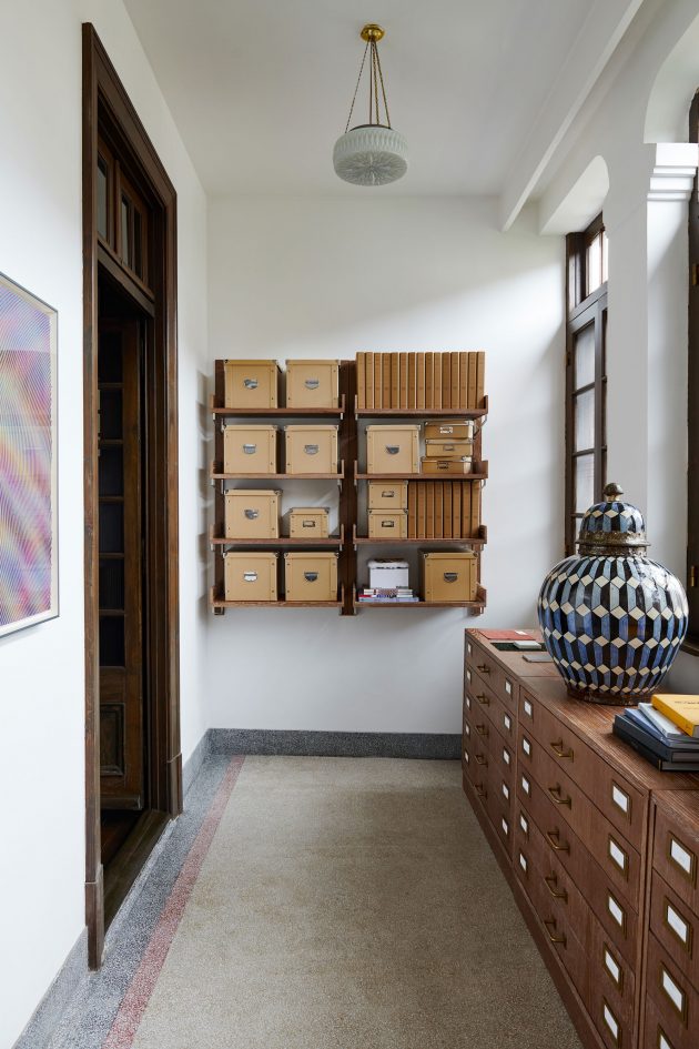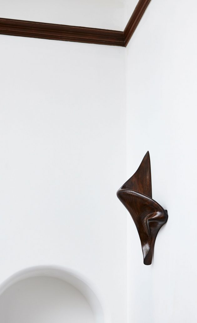 A quieter place is set up on the second floor: an antique desk from the 1950s designed by the famous Italian architect and designer Gianfranco Frattini, paired with one of the signatures of Paris brand R&Y Augousti – Eden Chair. Empty pens and bronze with black horse hair, exotic and mysterious. The objects on the stove were accidentally discovered by the Chris Shao while traveling in Morocco. They are three rare vessels made of camel bones, all hand crafted by local craftsmen. What’s in resonance with them is a natural bone-shaped candle in the fireplace, designed by Studio Morrison.