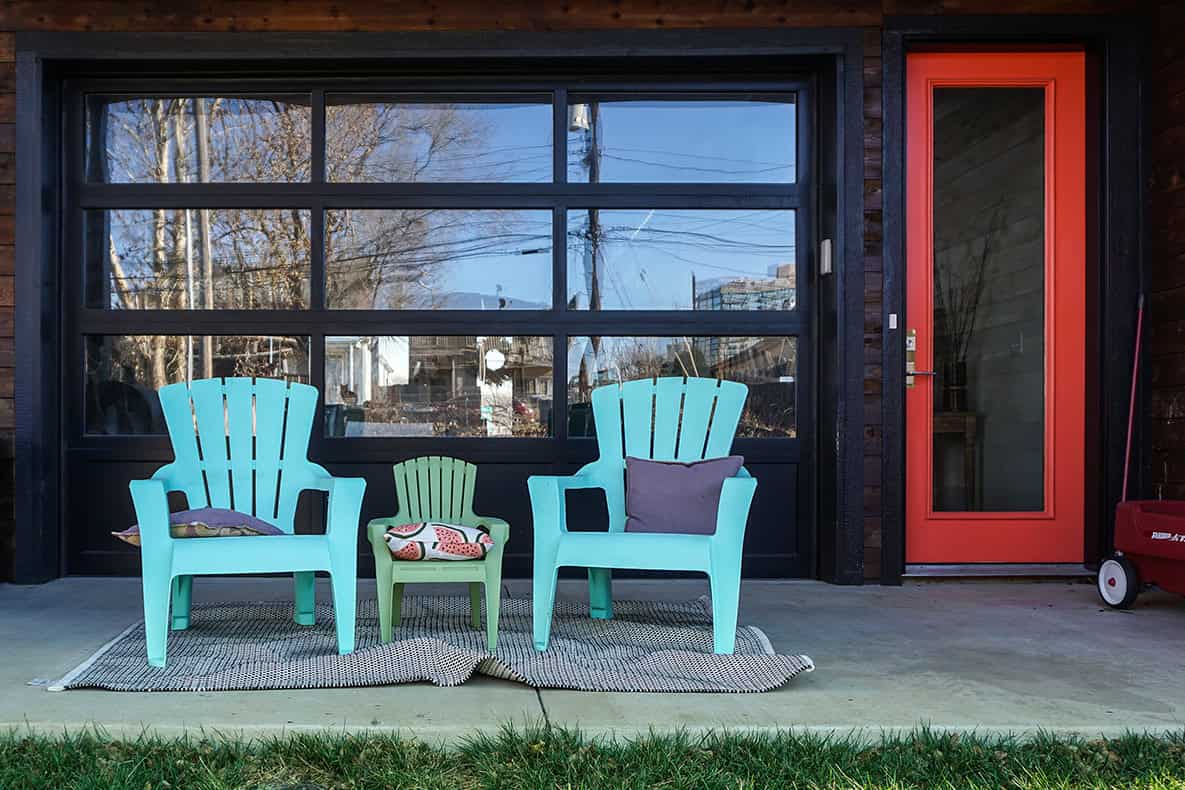 Modern custom home with a striking architectural design featuring bold color accents and contemporary outdoor patio furniture, exemplifying innovative architecture art and stylish residential design.