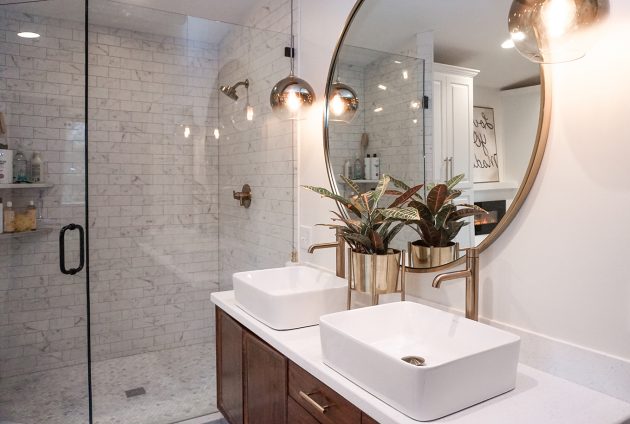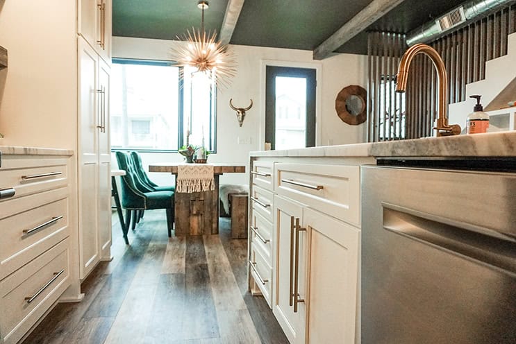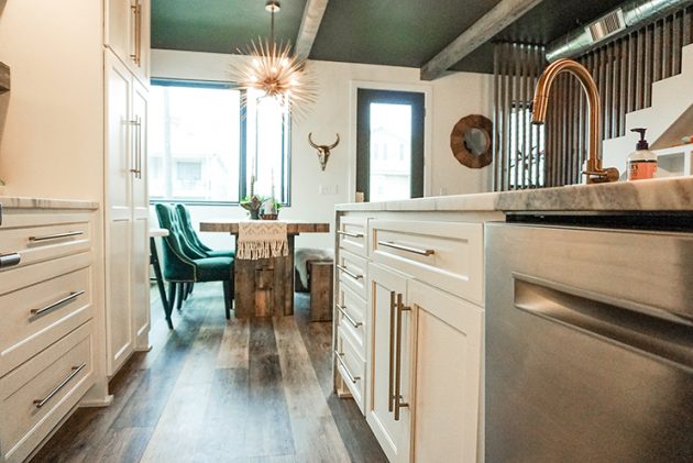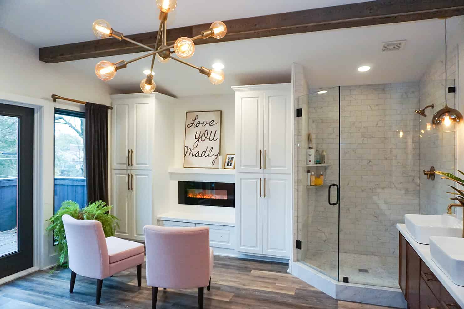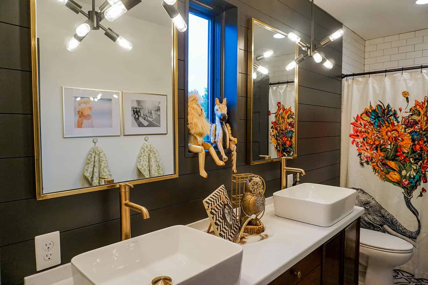 The house is filled with unique features. Brushed brass in both the plumbing and lighting fixtures, bold wallpapers, black ceilings, black shiplap walls, patterned tile, reclaimed wood beams, plus an open concept master suite with the shower in the bedroom.