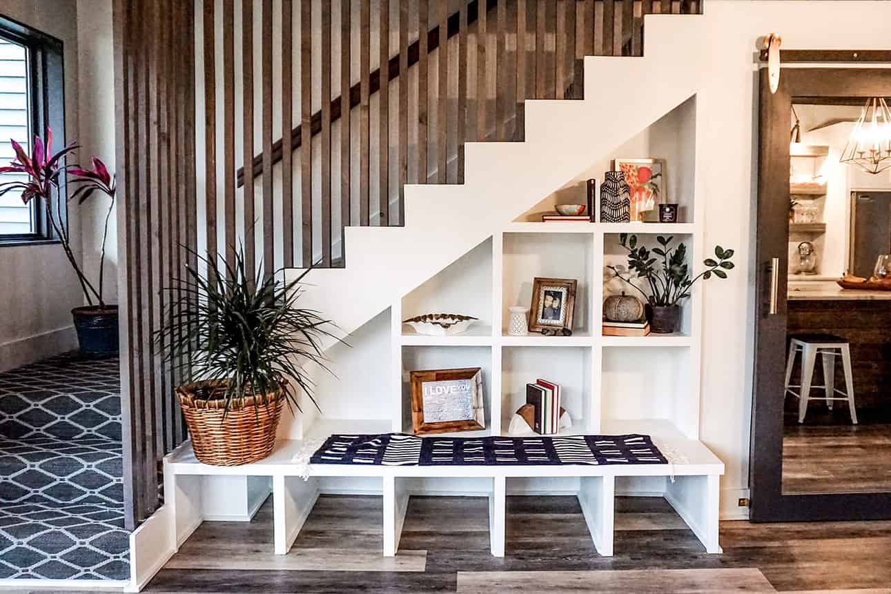 This new family house is a two-story modern “shotgun” home. The first-floor plan is open, with views from the entry point to the back yard. Upon entry, you are greeted by a modest dining space and the entry stairwell. The stair is a focal point in the house, with custom built-ins and decorative mid-century style railing.