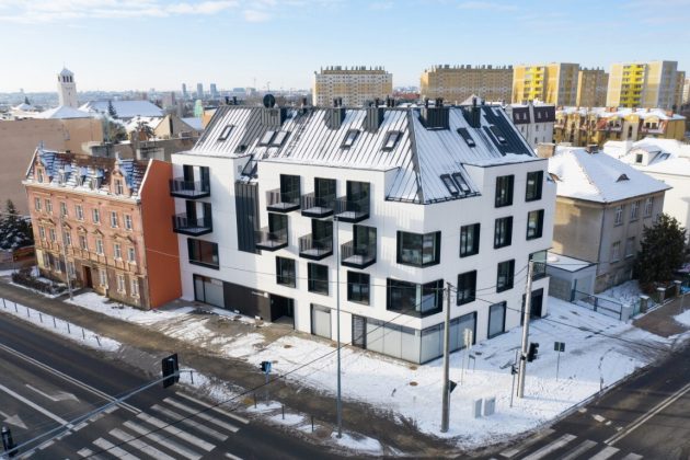Located at the intersection of St. Leonard and Piątkowska Streets, the building designed by Easst Architects has both commercial and residential function. It was built on a degraded space that had previously been a parking lot for years.
