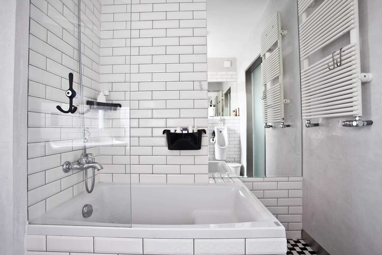 The apartment is alive and constantly changing. Fix elements are neutral. Resin flooring in shades of gray plays with timeless white walls. As lamps, simple bulbs suspended with colored cables are used highlighting the functional areas of the apartment. The whole enviromnent creates a versatile background for appliances and furniture, exposing them to the point where even the humblest object becomes a work of art. An steel spiral-staircase connects the two levels. It is strong, structured even graphic accent that emphasizes the consistency of the ground floor. The surface of the mezzanine is increased by 4 m2 thanks to the construction of a grid. The use of glass instead of railing let the light bath the space inside and allows you to admire the promenade along the Warta river. This is what impresses in this interior the most as well as its unpretentiousness. The owners have allowed themselves to several financial excesses (such as the drop-shaped extractor hood), which are unique and give the impression of luxury even though just a few things here are exclusive. This apartment is proof that even with a limited budget you can create a beautiful and timeless interior, where it is just nice to live in. And there is where the thrift lies.