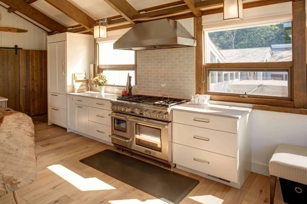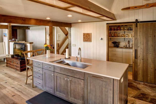 In the main part of the home, the kitchen, dining, and living spaces were opened up to create the homeowners dream kitchen and open living area. The kitchen includes features such as a custom hood vent, quartz countertops, white oak doors and beams, a built-in butler’s pantry replete with barn door, and a Thermadoor range.
