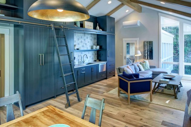 Not only does the new space hold an upgraded master suite and bunkroom, it also contains a kitchenette with library ladder, and additional dining and living space. Every effort was made to insure this portion of the home would be comfortable. In-floor radiant heat and extra close-cell foam insulation in the walls insure the space is extra cozy.