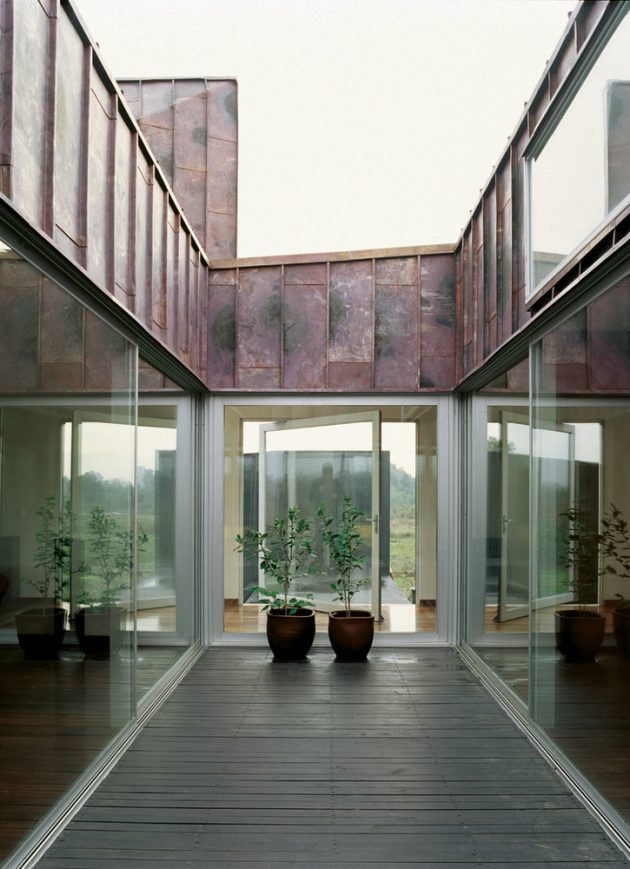 The Copper House 2 is an interesting project located in Talca, Chile. It was designed by Chilean architect Smiljan Radic around a central courtyard. As you can guess by the title of this project, the principal construction material that was used is copper. Additionally, the house is located on a beautiful open field so the architect made sure to leave plenty of openings for windows that will provide the inhabitants with wide views of their surroundings beside bringing sunlight inside.