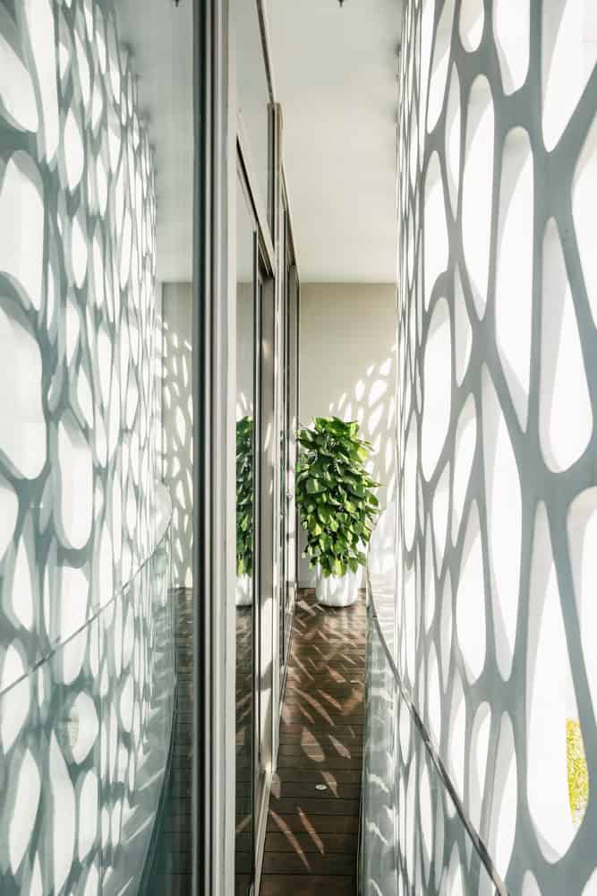 “The Coral Villa” is a family weekend retreat, nestled within the curve of Da Nang Bay. It is directly affected by the local tropical climate; hot and humid, with relatively high temperatures. The façade of “The Coral Villa” takes inspiration from local corals, poetically abstracted into the design and construction. The coral pattern is applied to screens made using fiber concrete. The screens act as a sustainable filtering layer, open for wind but preventing glare from sunlight. It keeps the privacy for users, and creates a unique identity home. The challenge in this project was to design a home which is environmentally open, blends in with nature, and yet still adapts to the conditions of the local climate.
