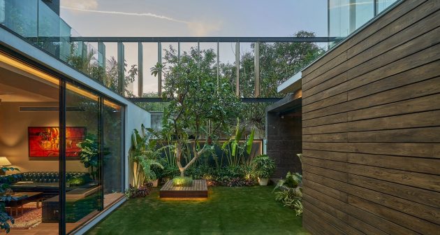 The home’s plan is anchored by a central courtyard, placed strategically at the corner of the site. This open-air void provides visual openness, natural ventilation, and a vital green lung for the house.