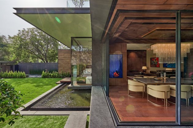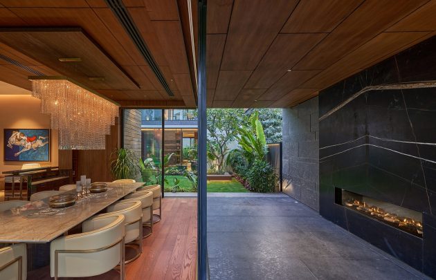 This space offers panoramic views of the verdant core while bringing natural light deep into the residence.