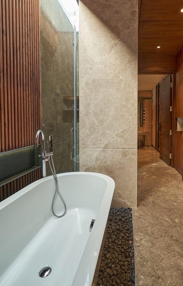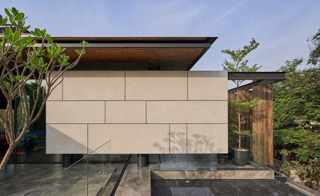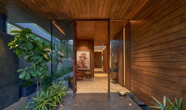 The entrance to Corner House is understated at first glance, but soon reveals a striking architectural gesture—a cantilevered timber-clad wall floating above a reflective water pool. This bold element transforms into an inverted L-shape, forming a shaded portico that filters early morning sunlight into the entry foyer.