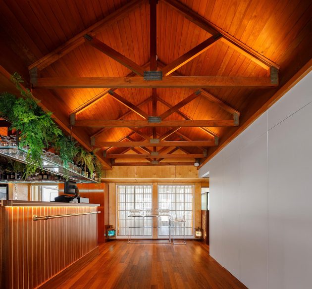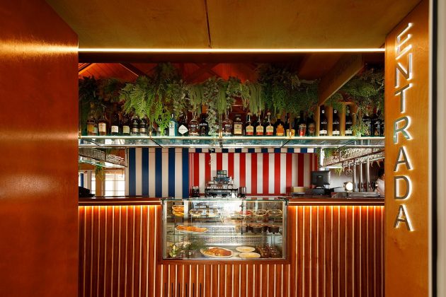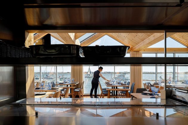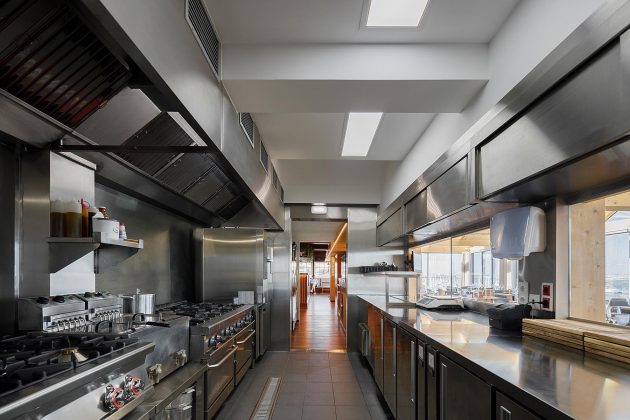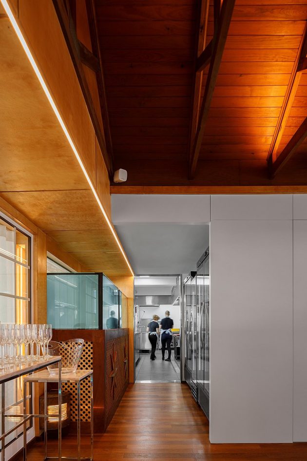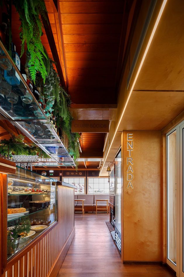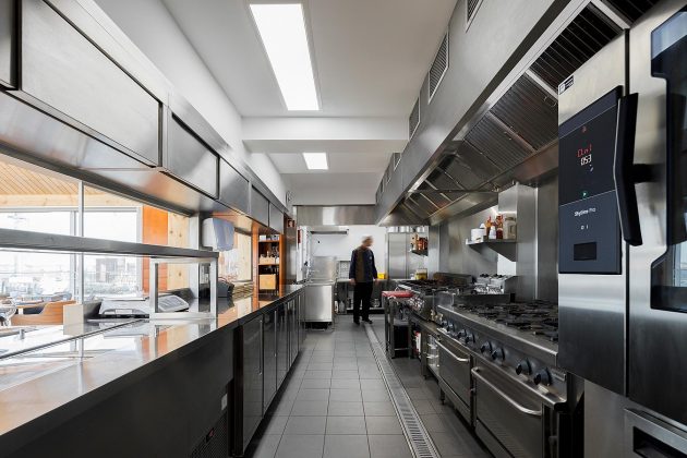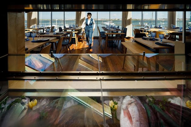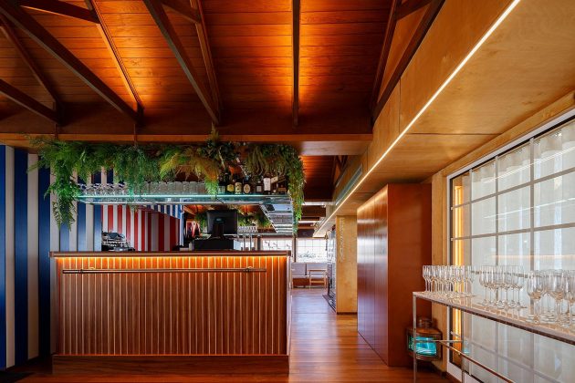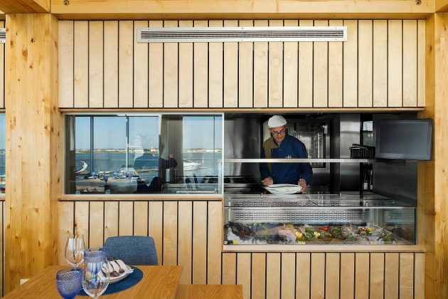 Thus, the wood remained as the backdrop of the typical Costa Nova haystack, so as to root this memory. However, it was always used allied to the modern technologies, as for example, in the backlit wood pieces, so to create a unique and comfortable environment. In terms of the morphology of the space, it was clear that its excessive division was hampering the flow of the route, so we decided to create a single counter, which maintained, even though sublime, the division between the restaurant and the bar. At the restaurant, we decided to take advantage of the back view over the ria through large spans with a minimalist expression to maintain a cleaner panoramic view. And the kitchen, now expanded, allowed the user to monitor the work and its conditions.