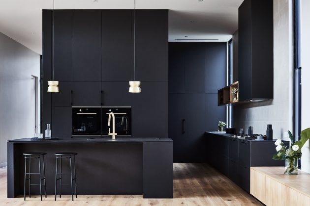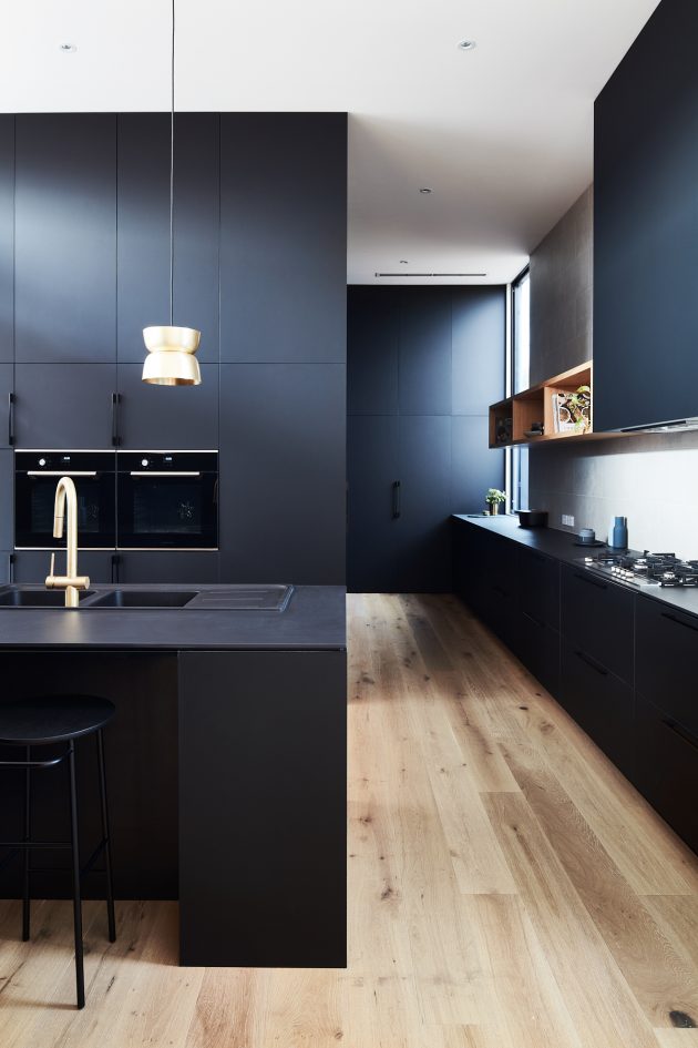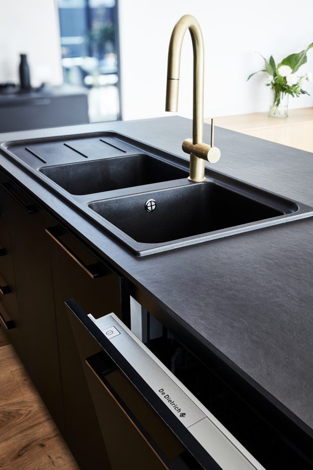 The modern matte black kitchen, accented with brass fittings and oak timber flooring make a stylish statement to the heart of the home.