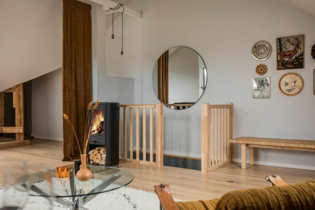 It is organized as a chill-out room where you can enjoy friends, reading, music… but due to its size and because there is a bathroom on that floor, it could be possible to organize a rest area with a bedroom or even two. The living room is very bright, thanks to the multiple windows in the ceiling and cozy, because of the chosen furniture and also because of the natural wood floor and exposed beams.