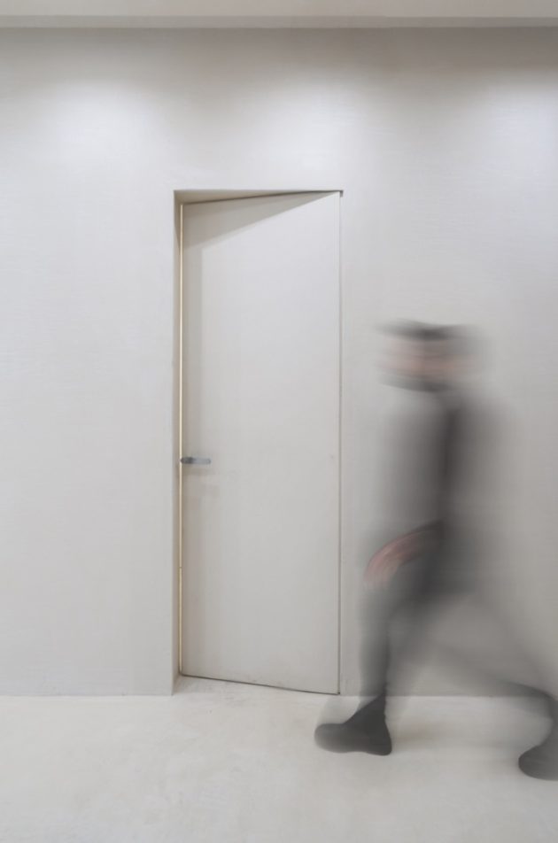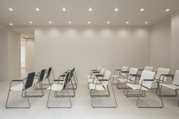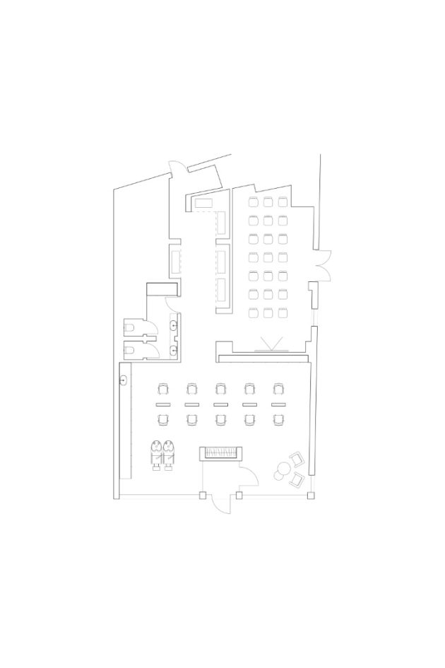 The practice zone regroups 10 workspaces, 2 wash basin chairs, a color bar, and a back bar. All three zones are conceived like one big open space where one can seamlessly move from one zone to another. Thanks to the big windows on the main façade the salon is completely exposed and promotes its activity easily to the public space outside.