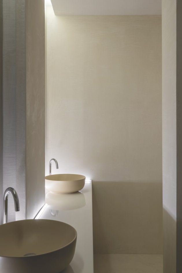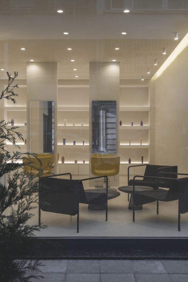 The main idea of this project was to create an atmosphere that emphasizes the moment of relaxation and self-care for the visitors. To achieve this all surfaces are treated with the same material, in warm and light earth toned color providing for a feeling of oneness. The very few additional color touches come from the furniture and the products on the shelves. Thus, this concept is in line with the elegant and luxurious image of the client’s brand, and provides soft and smooth atmosphere for all visitors.
