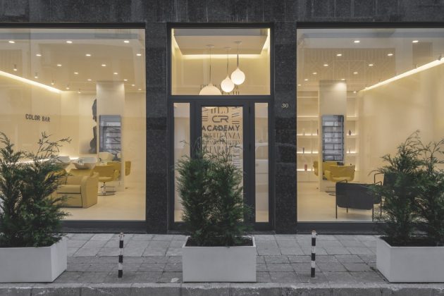 The project consists of redesigning the interior for a hair styling salon and academy. The space is located on the ground level of an existing building in Plovdiv, Bulgaria and occupies a surface of 150m2. It is divided into three main zones – a practice zone, an exhibition/product area, and a conference room.