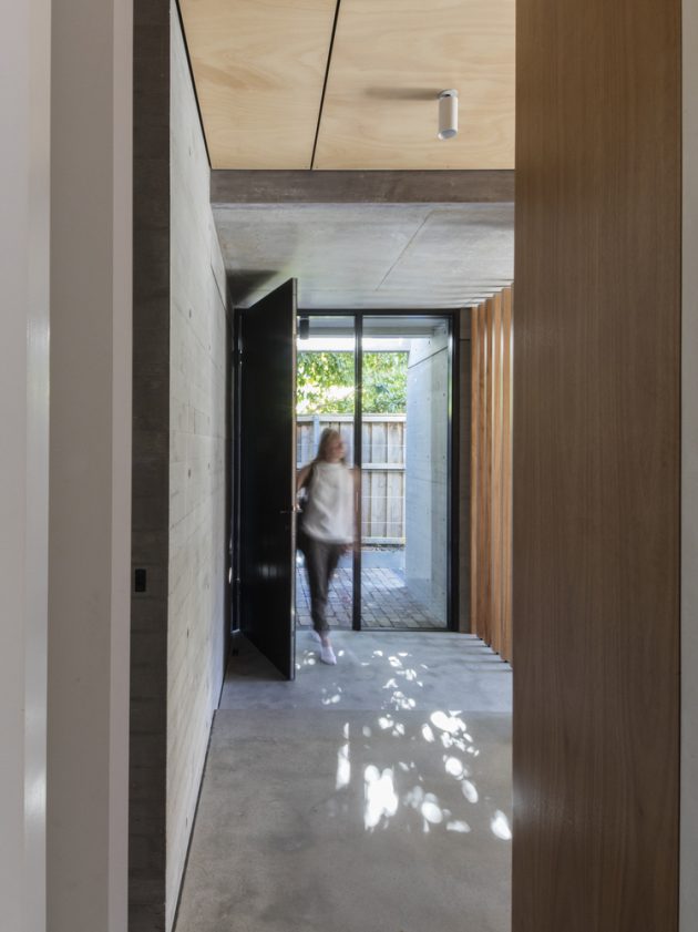 Finely detailed board finished concrete provides texture and mass to the study and entry spaces, while large timber framed glass sliding doors open from the dining and living spaces to the garden.