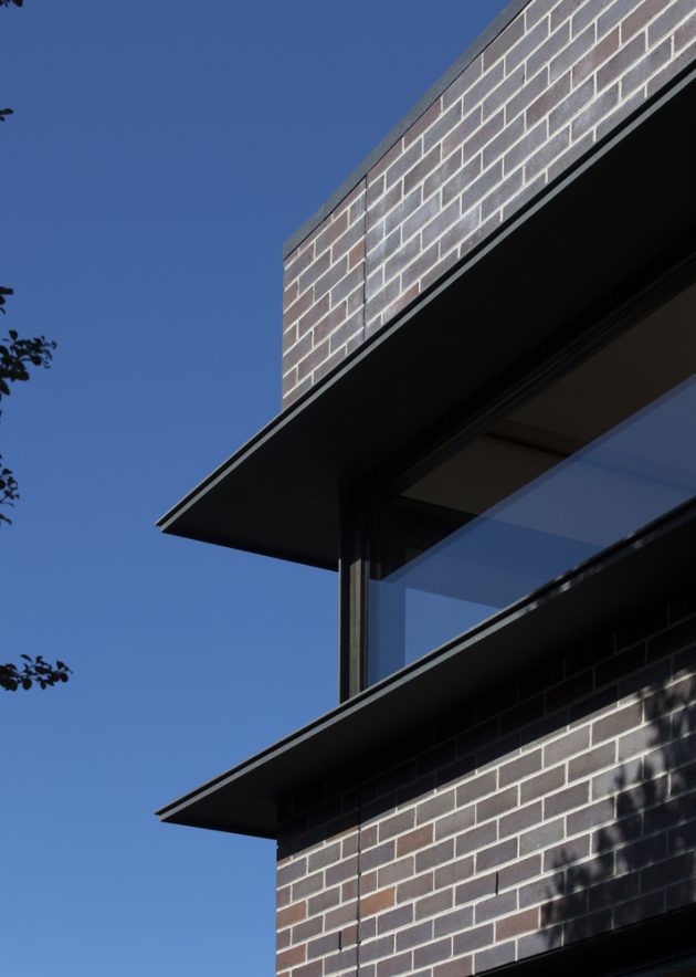 The upper brick volume is punctured by horizontal windows, framed by painted steel surrounds that protect the glass from the intense summer sun.