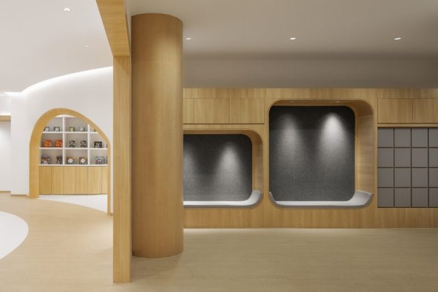 A circular open reading area greets visitors upon entering the main space on the second floor. The ceiling has a dimmable overall light source to meet the soft and moderate ambience required for children’s indoor reading. In addition, there are classrooms for exploration courses arranged around the reading area.