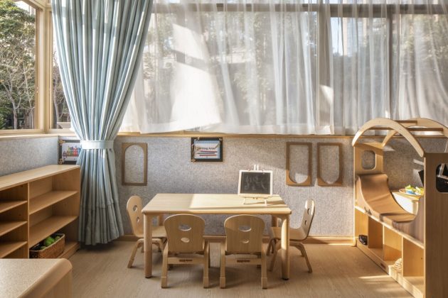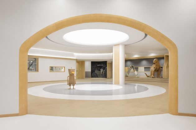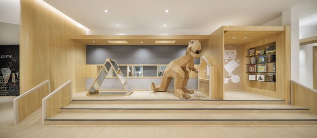 The main classrooms have external information displayed around the public space for children’s activities in various locations, to visually communicate the teaching content of each class to both parents and children. There is also a platform area where amusement and drama performances can be held in the public space, which anticipates for the diversified teaching content to come in the future.