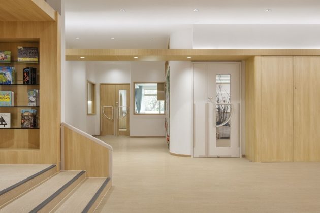 VMDPE Design has allocated reception, security, meeting rooms, logistics, and medical services to the first floor. The central storage area for changing shoes isolates outdoor dust and dirt, and prevents their spreading to the rest of the building. Additionally, there is another hall in the lobby with sufficient area to facilitate children’s morning health check in to the kindergarten, as well as large-scale events and gatherings.