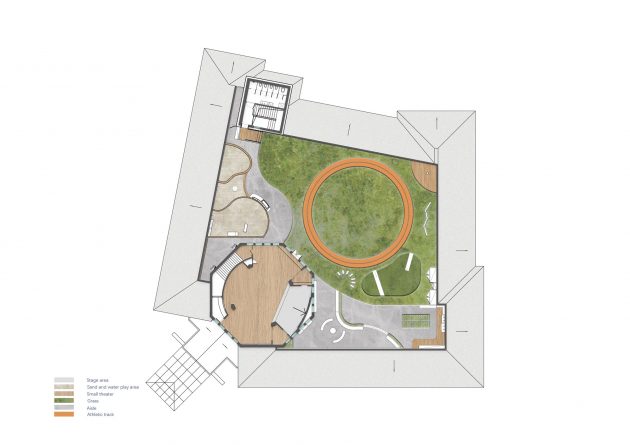 In accordance with the project’s program, the outdoor area occupies the third floor/roof of the building, with a generous outdoor activity space complete with supporting facilities such as a steam learning zone, small farm, sand pit, and water play area. Also on the third floor, there are gathering areas and stages, plus a multifunctional hall for performances, dance rehearsals and other functions.